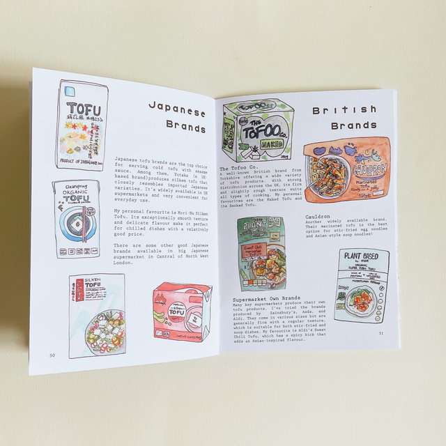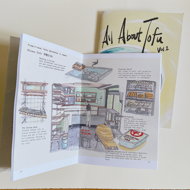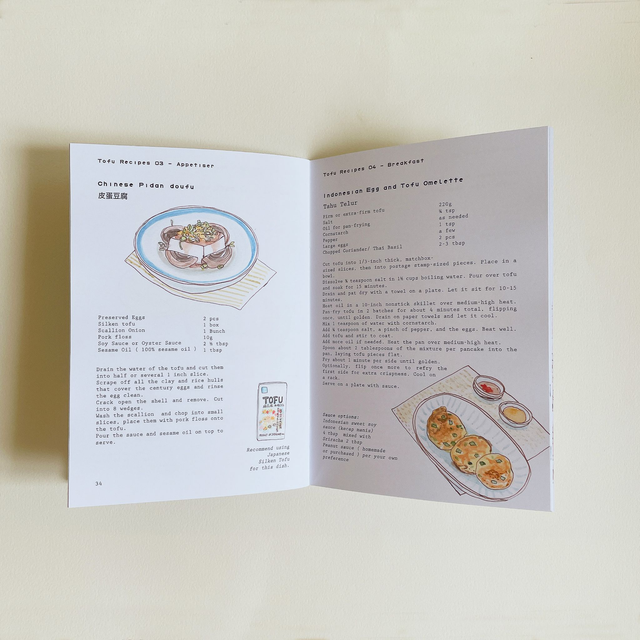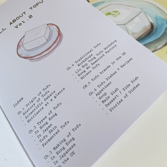 This zine is created for tofu enthusiasts—an enriched edition based on Vol. 1. It presents a comprehensive narrative, exploring the origins and global spread of tofu. The zine includes tofu nutritional value and the ongoing scientific debates surrounding its impact on health. It also explains and compares traditional tofu-making methods in Hong Kong, Japan, and the UK. Readers can enjoy a virtual tour of selected historic tofu shops in Hong Kong and Japan. It concludes with a complete tofu-themed menu, featuring 16 recipes for selected tofu dishes from across Asia. Fully illustrated with the watercolour illustrations by the author.