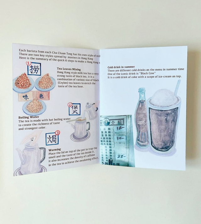 A zine presents some basic facts of Hong Kong Style Cafe and Cha Chaan Teng, including: step to step milk tea making, discovering the menu in Cha Chaan Teng, pastries box highlight, special cold drink highlight.